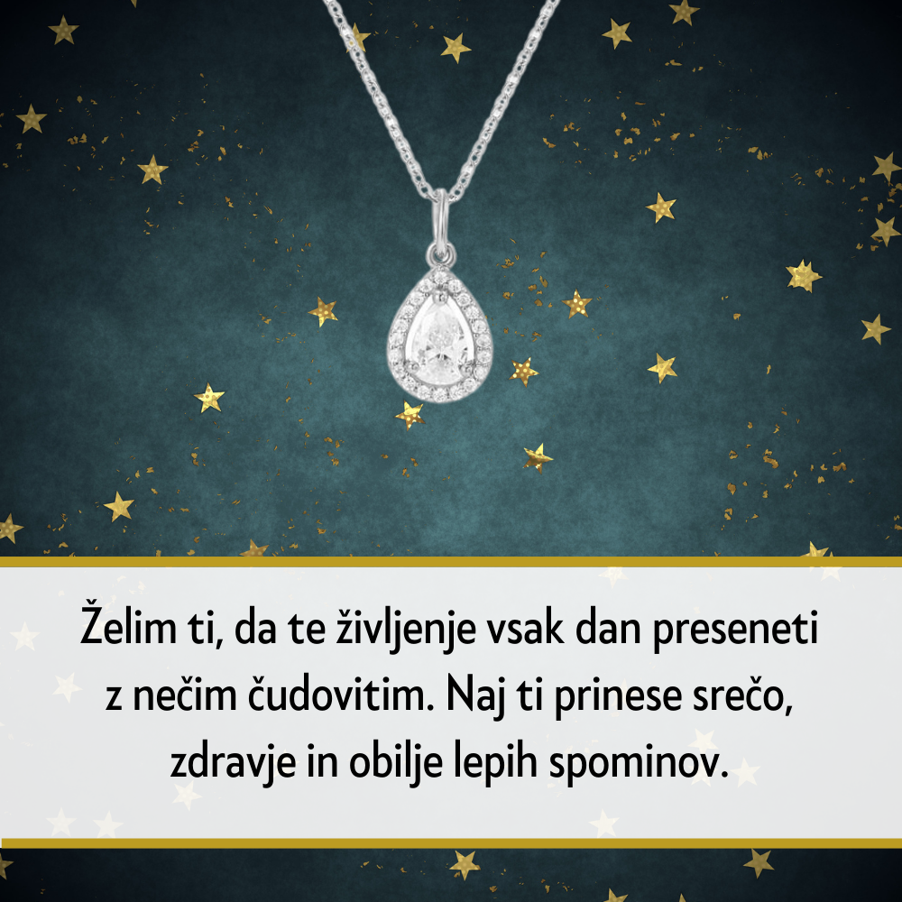 - Kapljičasti obesek, obdan s cirkonijevimi kristali za sodobno eleganco.